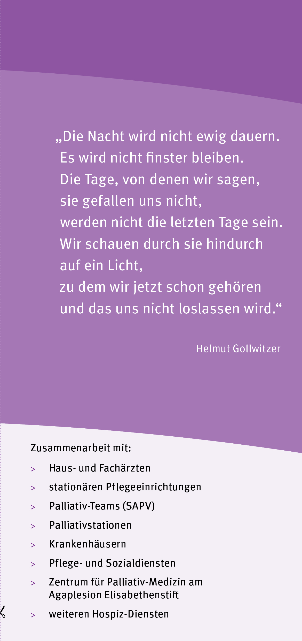 Wir fühlen uns als Teil der diakonischen Familie und wollen in dieser Gesellschaft unseren Auftrag zur Nächstenliebe in Wort und Tat wahrnehmen. Wir wollen helfen! Dabei, wenn Menschen sich schwach fühlen. Wir wollen sie ernst nehmen, für sie da sein und für ihre bleibende Würde eintreten. Dazu gehört auch das Benennen der Ursachen von sozialer oder versorgungsbezogener Not gegenüber Politik und Gesellschaft. Dabei wirken wir gemeinsam als Teil der Hospizbewegung durch die Förderung hospizlichen Denkens und Handelns für ein humanes Gesundheitswesen.