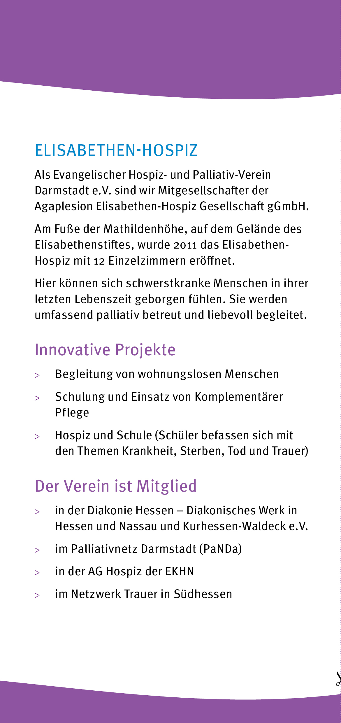Der Evangelische Hospiz- und Palliativ-Verein Darmstadt e.V. versteht sich als Teil der überwiegend kirchlich geprägten Hospizbewegung in Deutschland. Er knüpft mit anderen ein Netz von Hospizarbeit und palliativer Versorgung in Darmstadt und im Landkreis Darmstadt-Dieburg. Sein Angebot ist eingebunden in Kooperationen mit Mediziner*innen, Pflegediensten, Sozialen Dienstleistungen und Seelsorgeangebote.